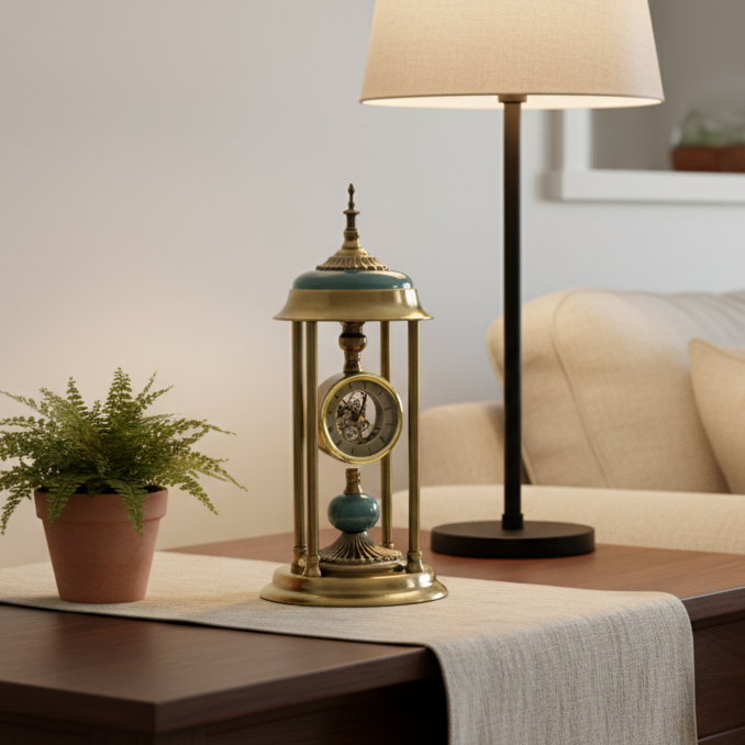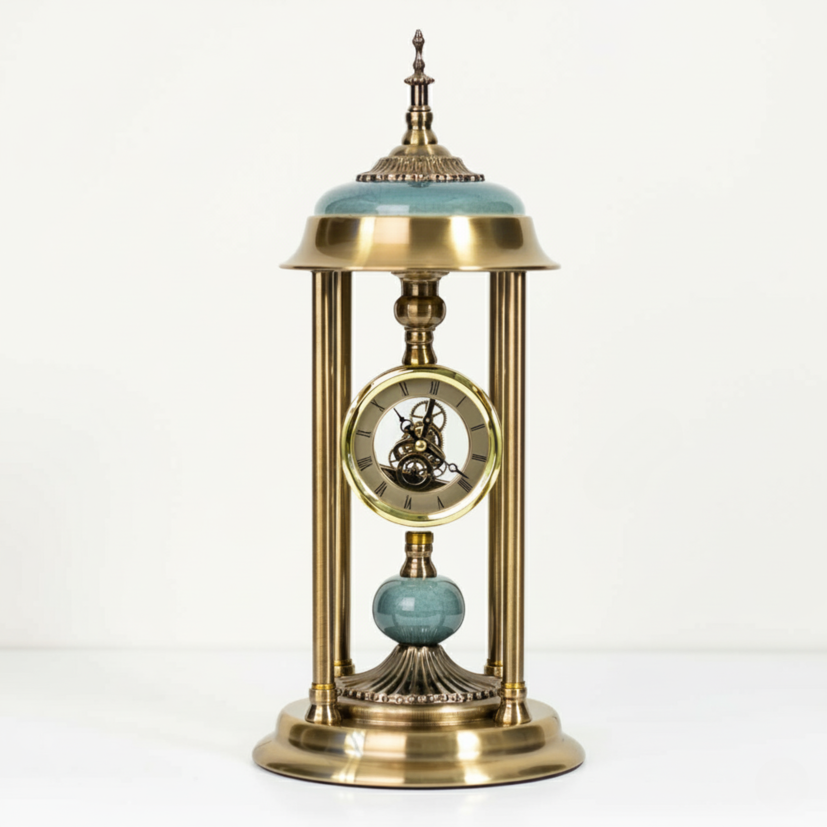 This elegant clock features a beautiful gold and soft green finish with a fascinating open-frame design. Its visible gears and unique structure make it a wonderful centerpiece for any table or shelf. It’s a great way to add a touch of timeless charm and sophisticated craftsmanship to your home.