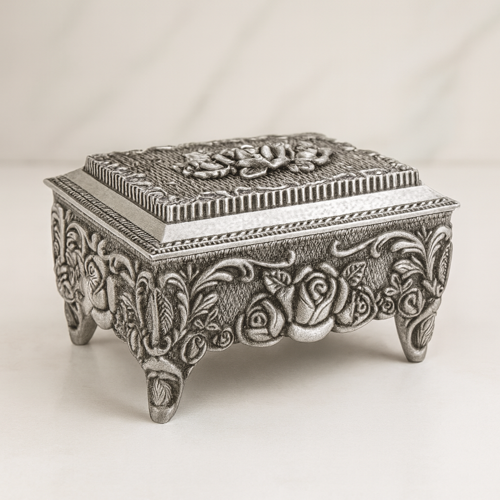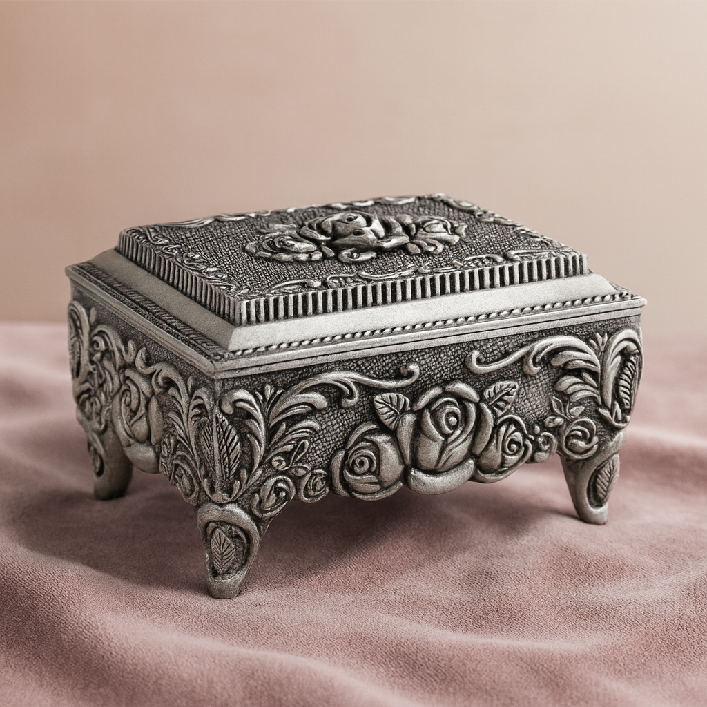 The interior is lined with a soft velvet, ensuring your most treasured jewelry and keepsakes are protected. Supported by four sturdy feet, this piece stands with grace, making it a perfect gift for a loved one or a luxurious treat for yourself.