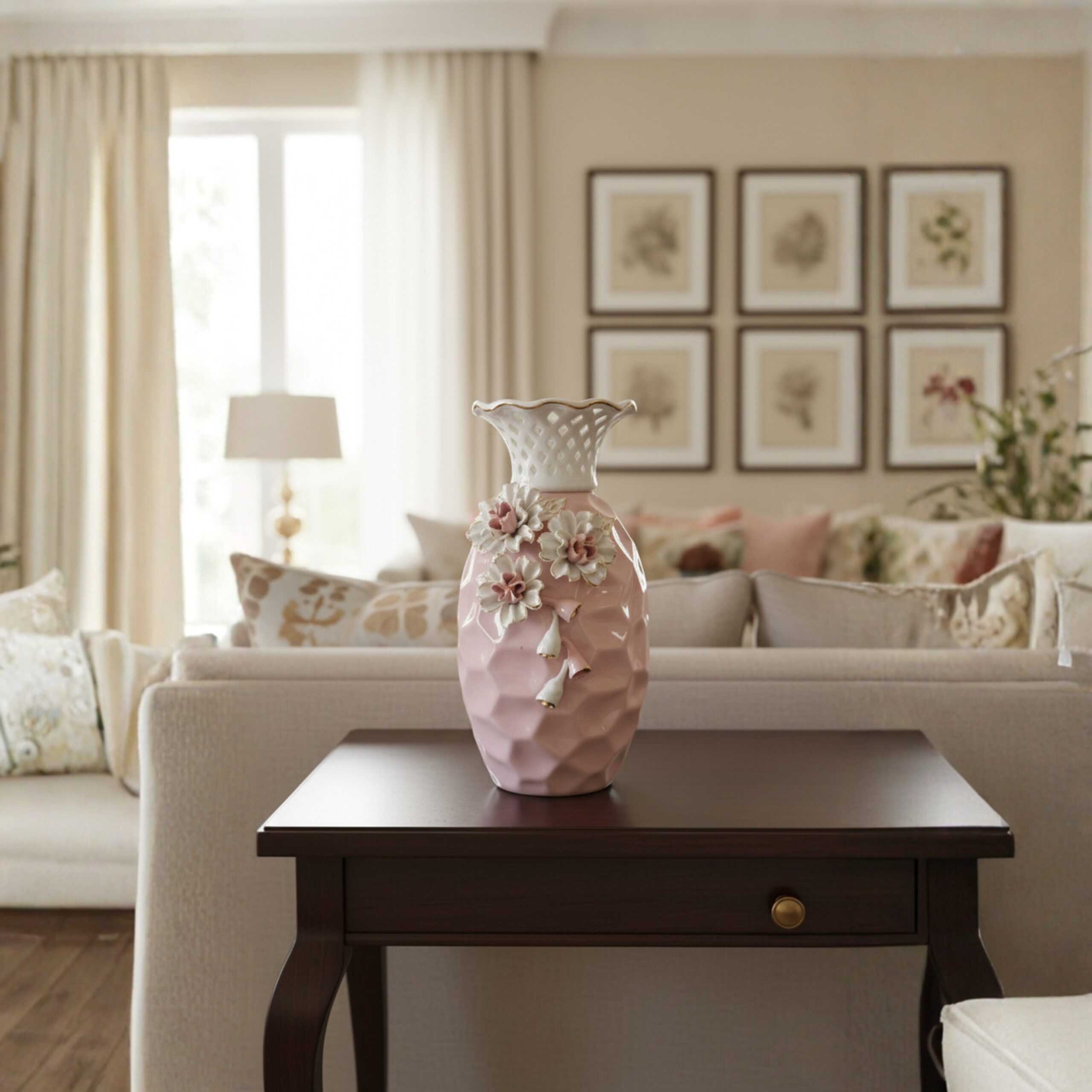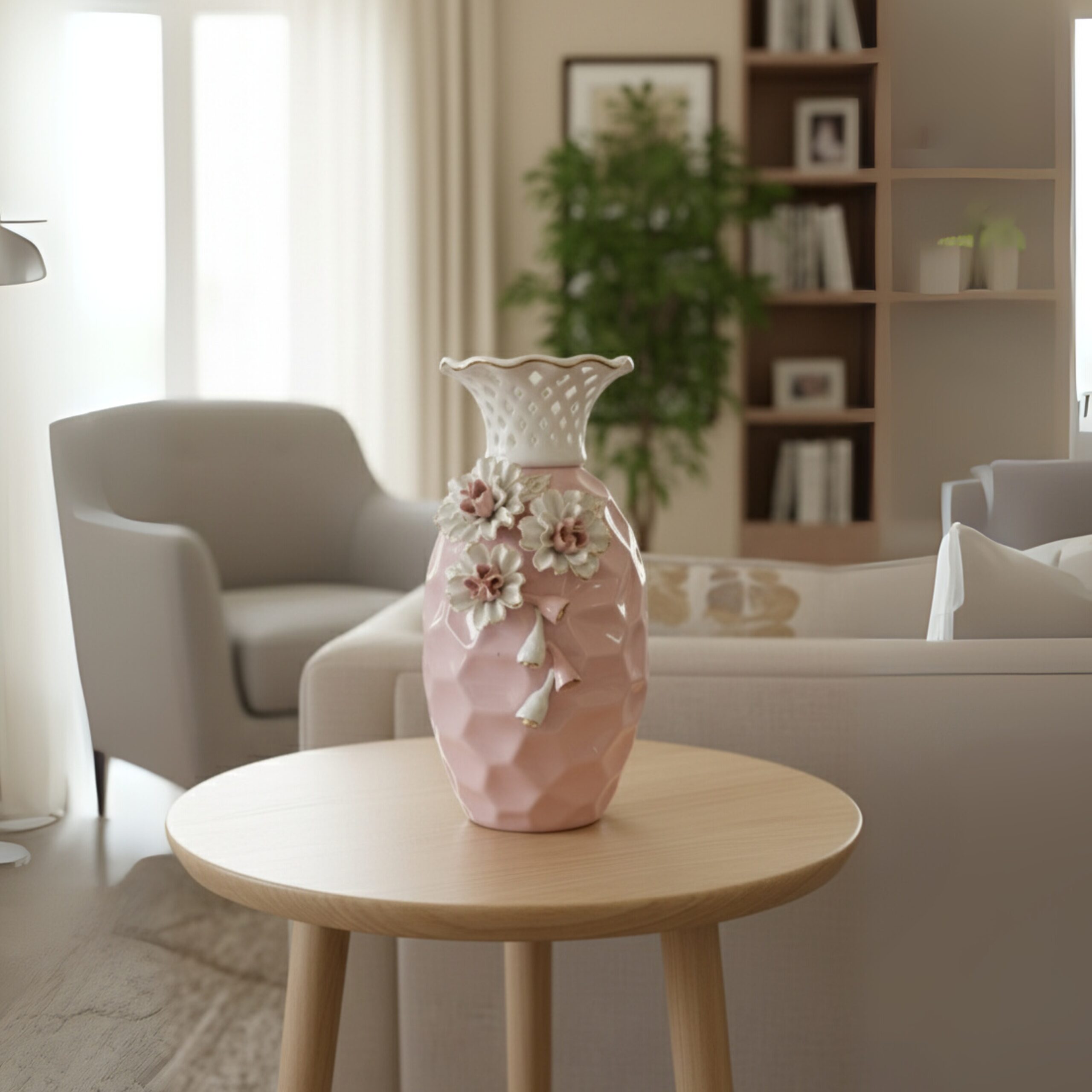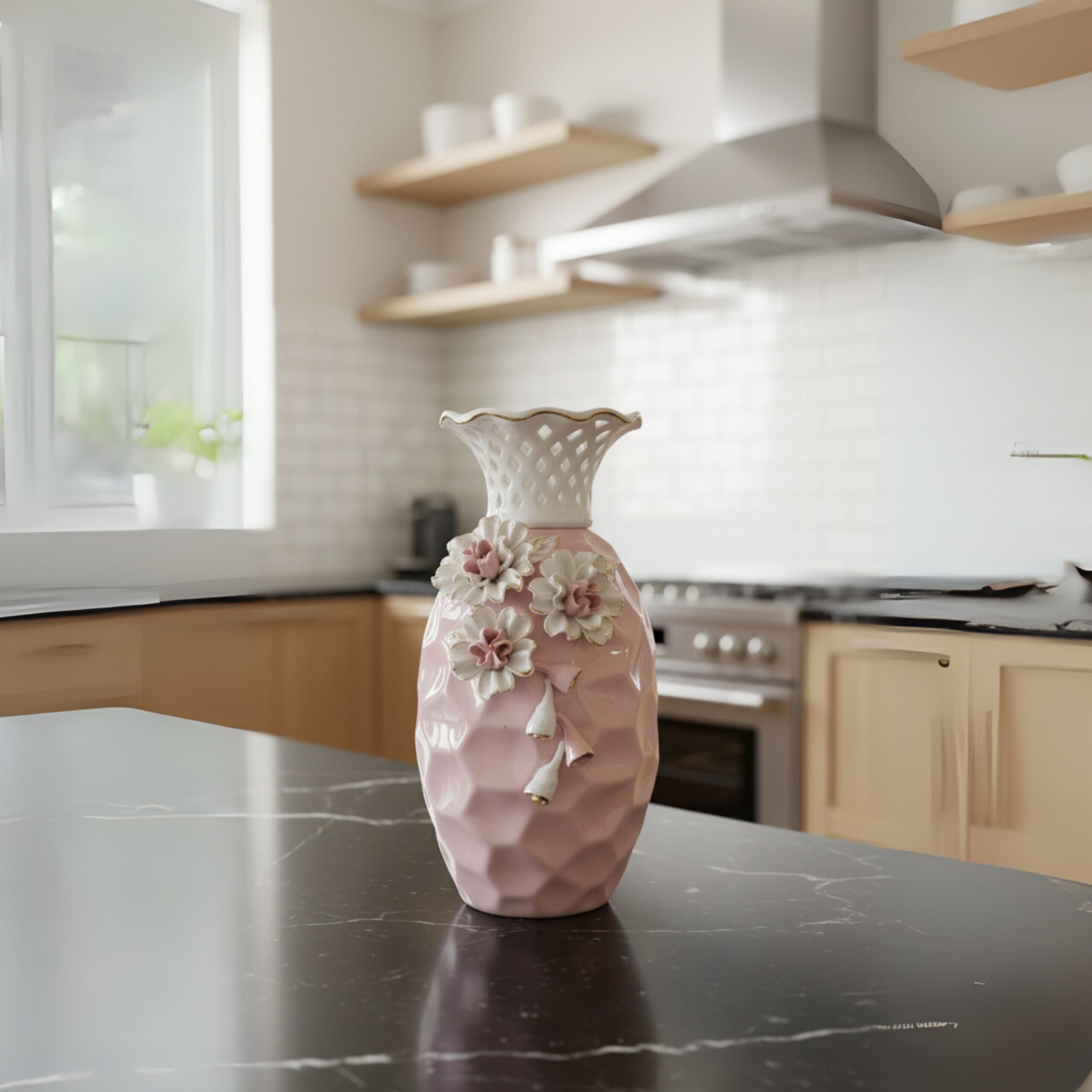 Add a touch of elegance to your home with this beautifully handcrafted ceramic flower vase. The vase features a soft pastel pink finish with delicate 3D floral embellishments
