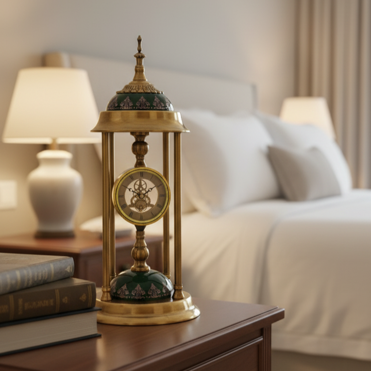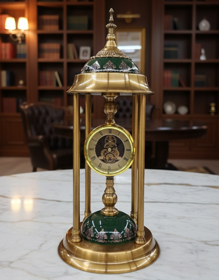 This elegant clock features a beautiful gold and deep green finish with delicate floral patterns. Its unique open-frame design and visible gears make it a fascinating centerpiece for any table or shelf. It’s a wonderful way to add a touch of timeless charm and sophisticated craftsmanship to your home.